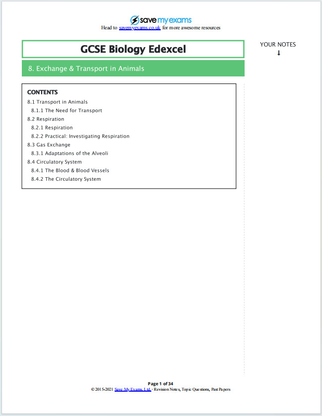 内容范围: 涵盖了Edexcel GCSE生物课程大纲中的 第8单元:动物的物质交换与运输