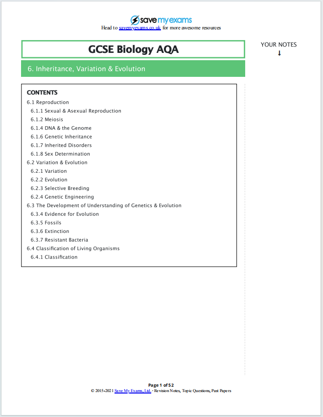 这是 Save My Exams 网站提供的 GCSE Biology AQA Revision Notes,主题为 Inheritance, Variation & Evolution(遗传、变异与进化)。这是一份全面的复习资料,涵盖了GCSE生物课程中关于遗传学、变异和进化的核心内容,帮助学生准备考试。