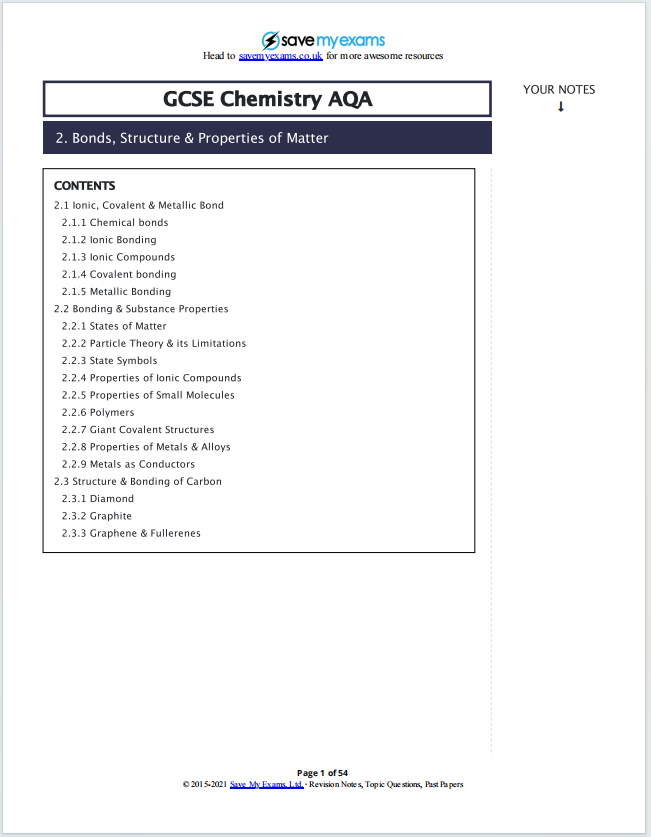 这是由 Save My Exams 出品的《GCSE Chemistry AQA: 2. Bonds, Structure & Properties of Matter》复习资料,是针对 AQA 考试局 GCSE 化学 “化学键、物质结构与性质” 主题的权威备考资源。以下是全面详细的介绍: