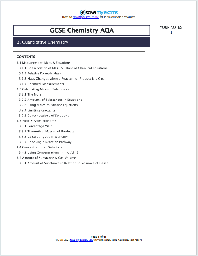 这份资料是 《GCSE Chemistry AQA》修订笔记的第三章,主题是定量化学。这一章是化学从定性描述走向定量计算的关键,也是许多学生认为最具挑战性的部分之一。以下为您进行全面详细的介绍。