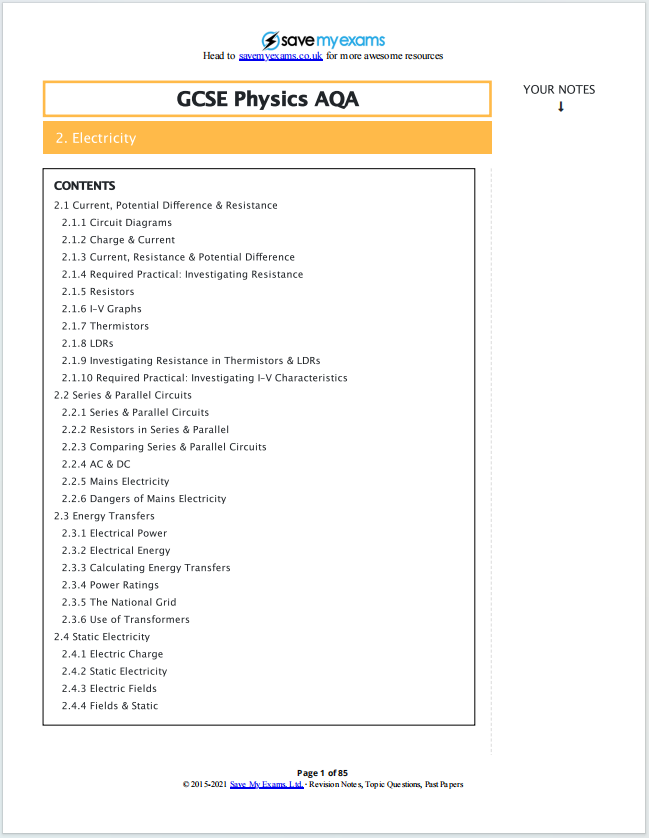 这份资料是 GCSE Physics AQA 复习笔记系列中的 第二单元:电学。这是整个GCSE物理课程中内容最广泛、最核心的单元之一。以下是关于这份“电学”单元资料的全面详细介绍: